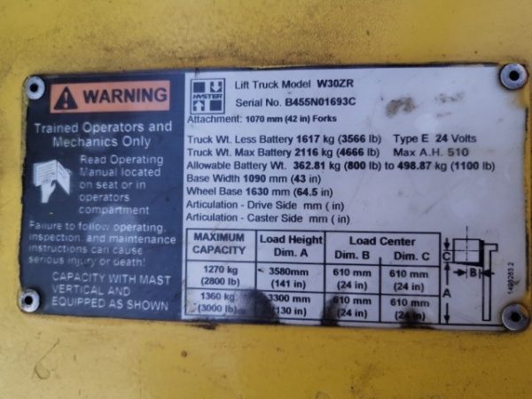 The Hyster W30ZR walkie reach stacker, 3580 mm lift height & capacity of 1360 kg. The crown Hyster walkie reach stacker is very easy to operate, ideal for a workplace which doesn’t have employees with forklift licences as you don’t need forklift licence to operate the W30ZR.
